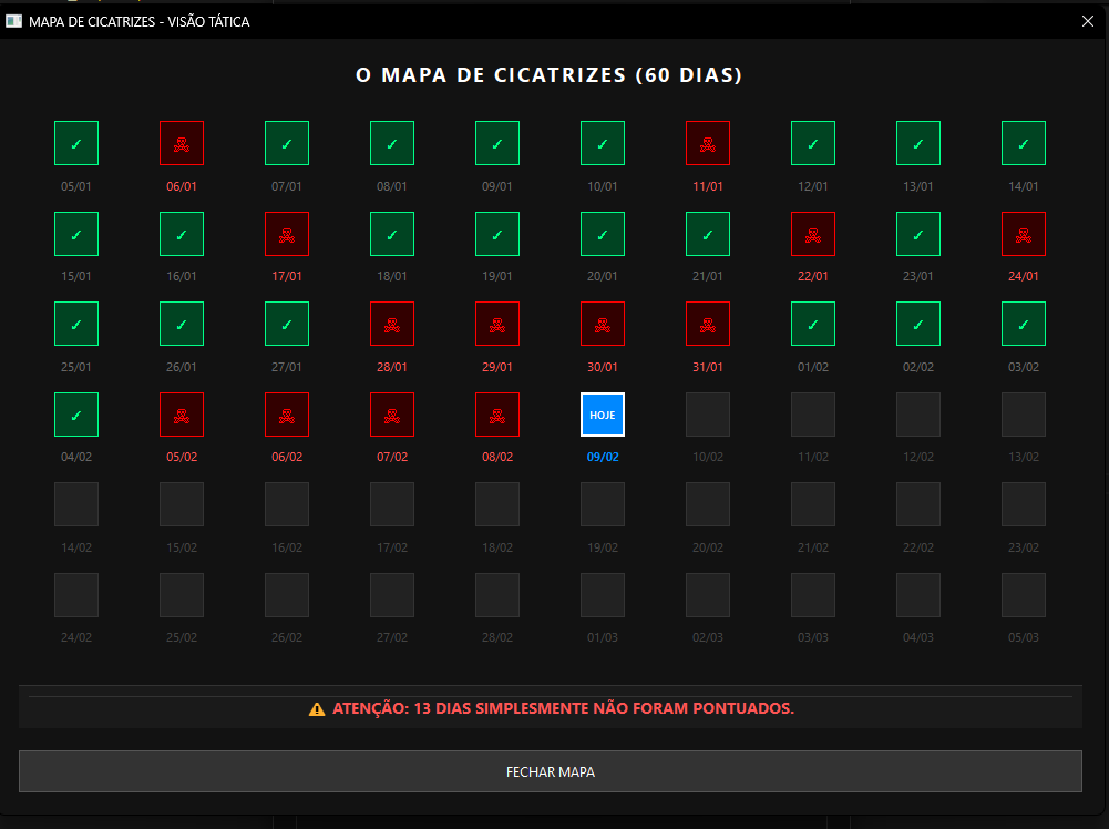Eu cheguei a conclusão de que o Log de Vitorias, que são os dias com pontos registrados, eles não dão o peso dos dias que passaram sem registro. Eu não sinto nada por ter perdido um dia. Então tive a ideia de criar algo visual, algo que pudesse passar essa dor.